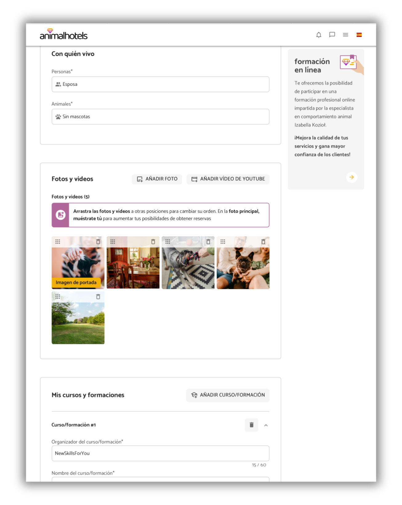 Esta sección permite al cuidador añadir información sobre los cursos, formaciones y certificados completados relacionados con el cuidado de animales. Esto hace que el perfil sea más fiable y ayuda a los dueños de mascotas a sentirse más seguros sobre las habilidades del cuidador.
