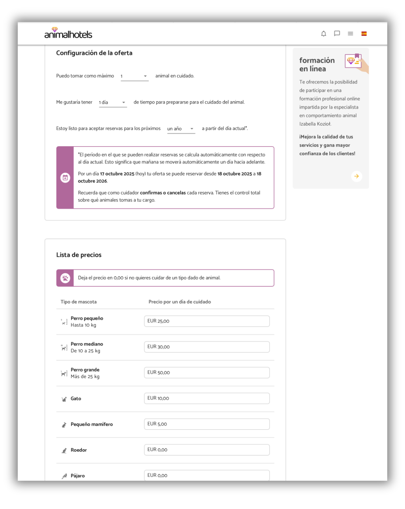 Introduce los precios para los tipos de animales de los que deseas encargarte. Deja el precio en 0,00 si no deseas ofrecer cuidado para un tipo de animal en particular.