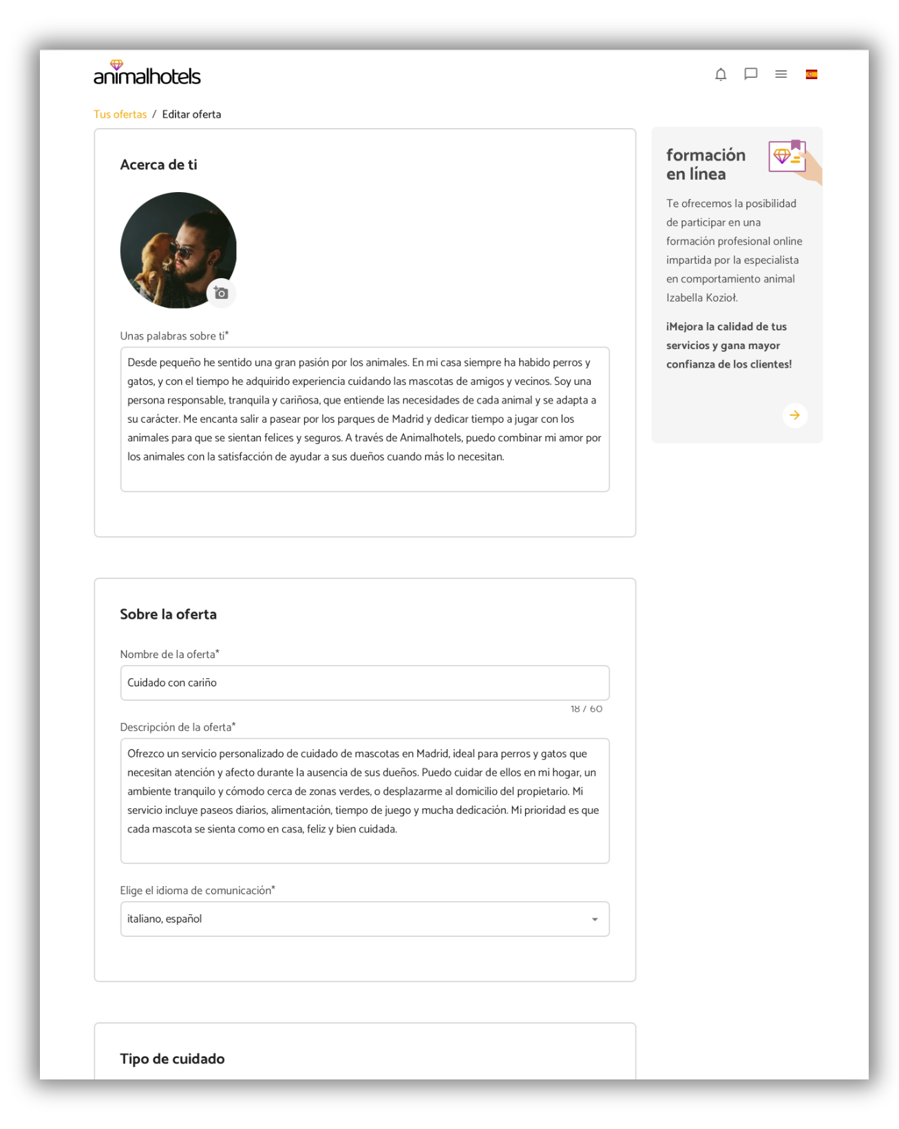 Recuerda especificar el tipo de cuidado que ofreces. Un hotel es un negocio registrado; un cuidador es una persona individual.