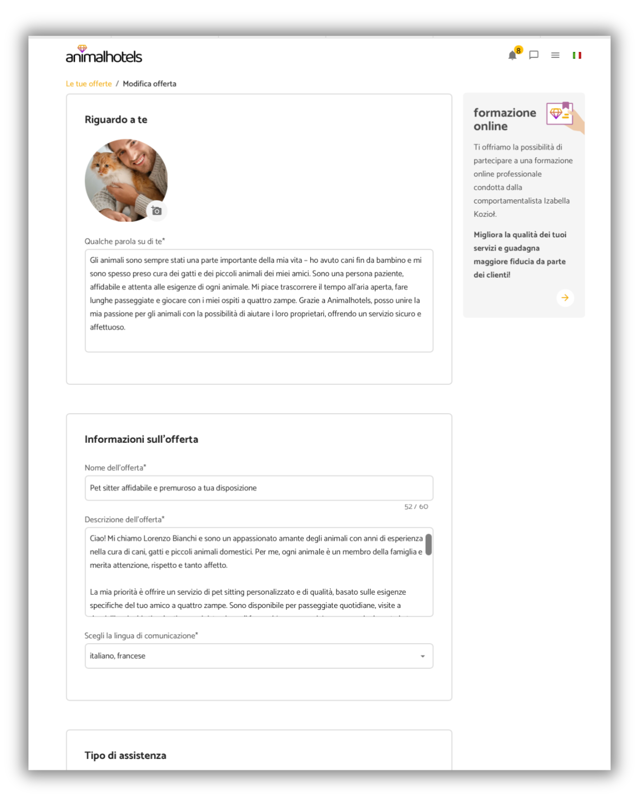Il numero minimo di foto è 3. Devono mostrare il luogo di accoglienza, l’ambiente circostante e te insieme a un animale. Più foto carichi, più la tua offerta risulterà interessante. Assicurati che le foto siano chiare e di buona qualità. Foto di scarsa qualità possono influire negativamente sulla tua offerta.