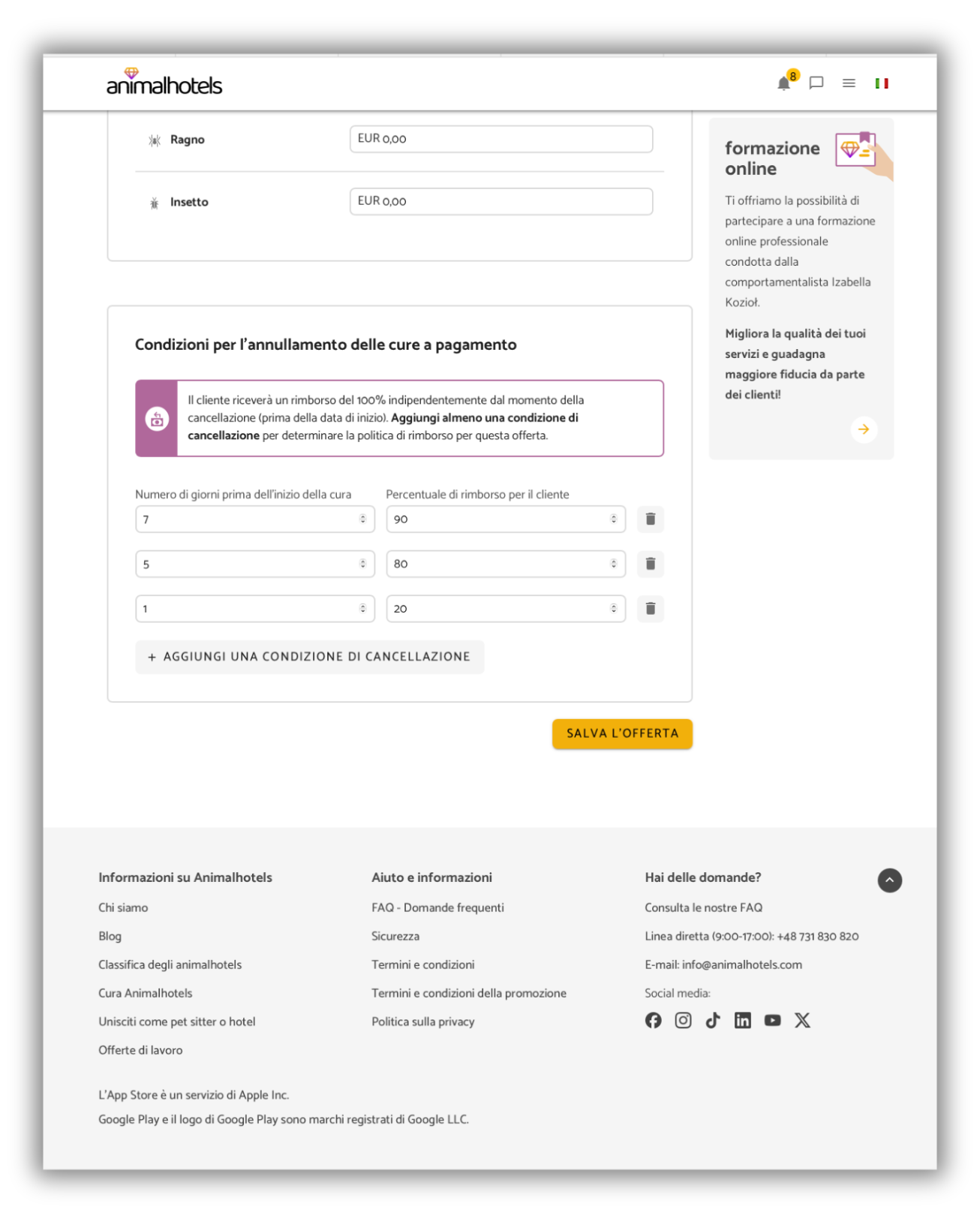Stabilendo condizioni di cancellazione chiare, puoi tutelarti economicamente: anche se un cliente annulla all’ultimo minuto, ad esempio il giorno prima dell’inizio della cura, potresti comunque ricevere una parte o l’intero pagamento. Tuttavia, se non vengono specificate condizioni, il sistema rimborserà automaticamente il 100% dell’importo pagato al cliente.