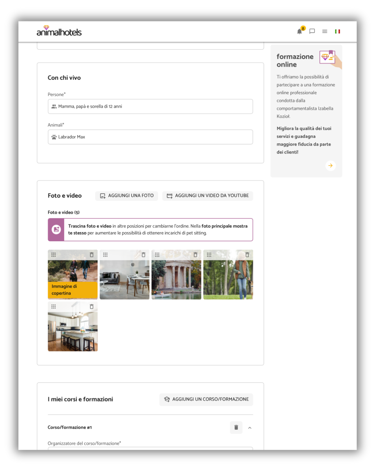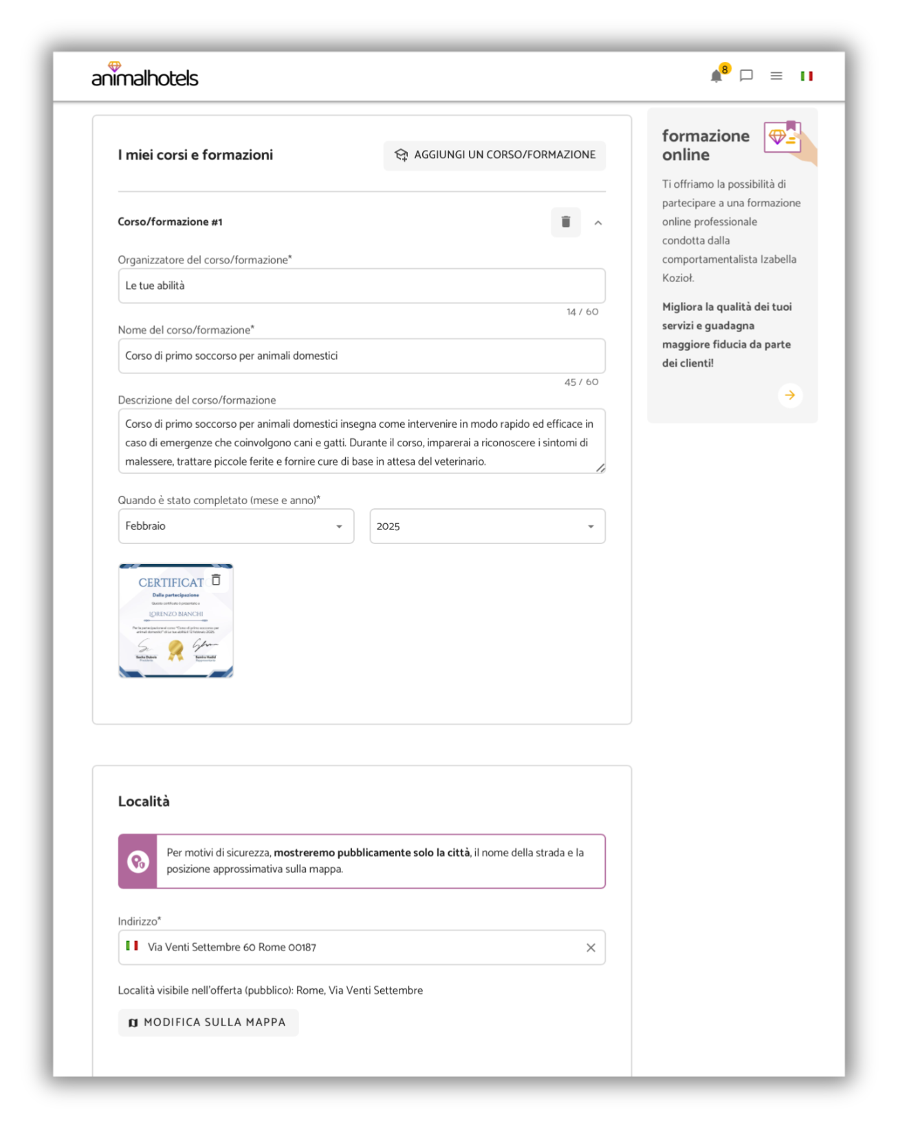 Questa sezione consente al pet sitter di aggiungere informazioni sui corsi, le formazioni e i certificati completati relativi alla cura degli animali. Questo rende il profilo più affidabile e aiuta i proprietari a sentirsi più sicuri delle competenze del pet sitter.