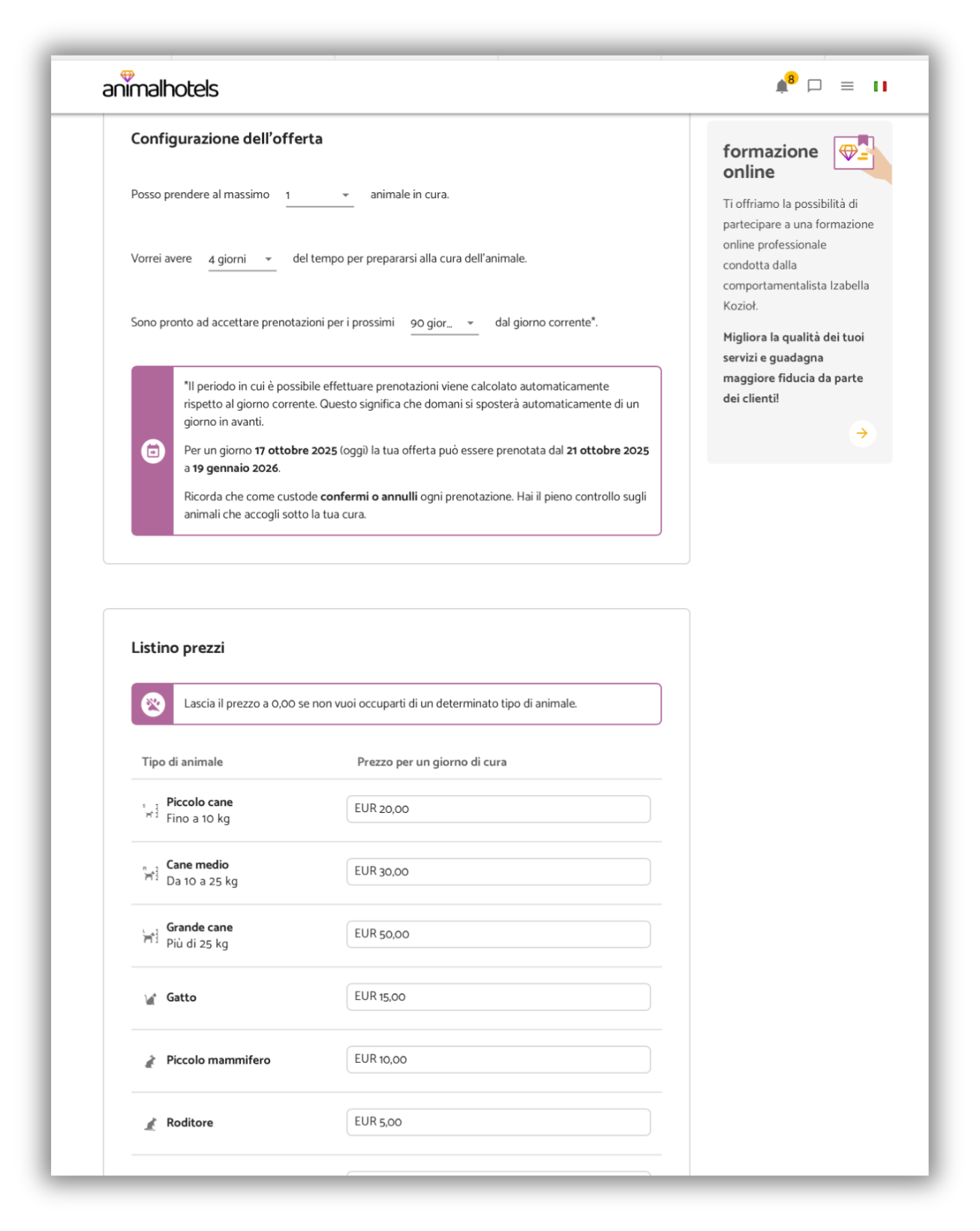 Inserisci i prezzi per i tipi di animali di cui desideri occuparti. Lascia il prezzo a 0,00 se non vuoi offrire servizi di cura per una determinata tipologia di animale.