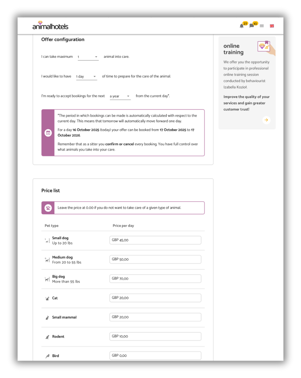 Voer de prijzen in voor de diersoorten waarvoor je wilt zorgen. Laat de prijs op 0,00 staan als je geen zorg wilt aanbieden voor een bepaald type dier.