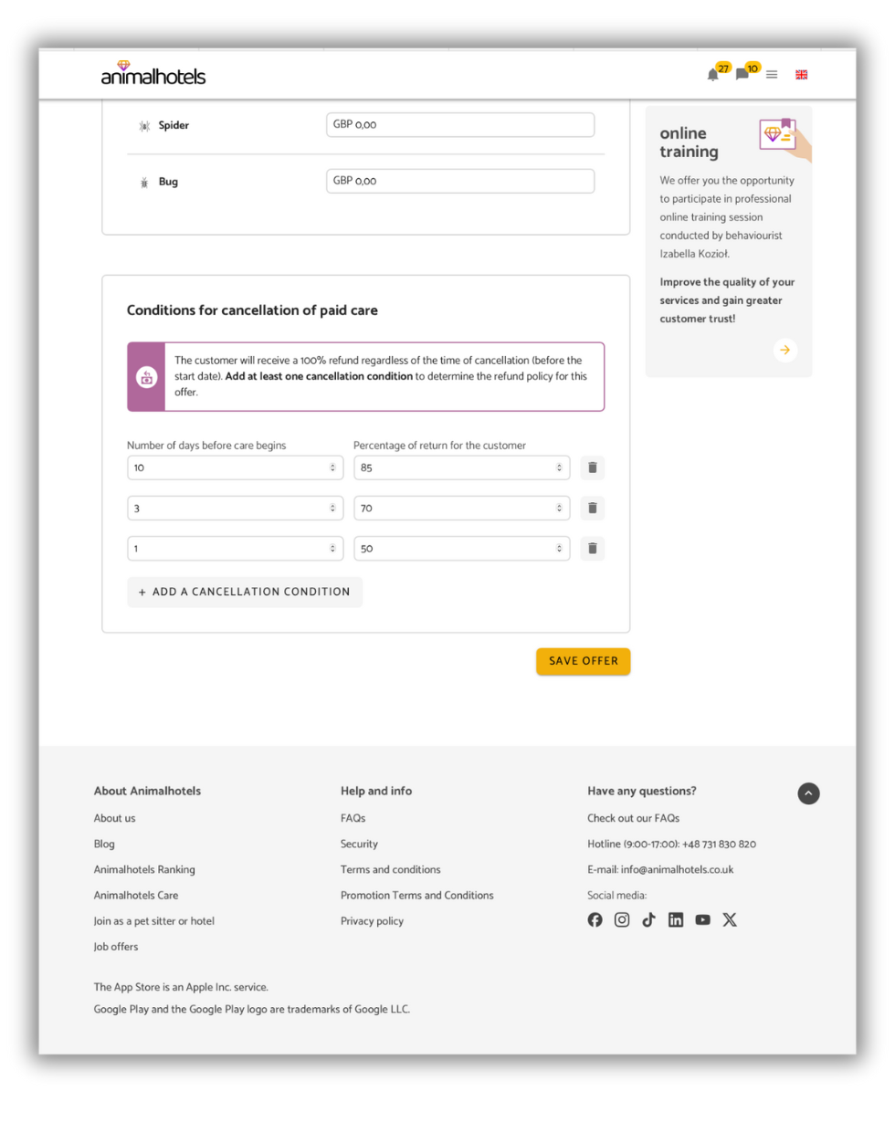De annuleringsvoorwaarden zijn een optioneel maar uiterst nuttig onderdeel van je aanbod. Ze zorgen ervoor dat huisdiereigenaren bij het boeken meteen op de hoogte zijn van de regels, vooral als ze moeten annuleren.