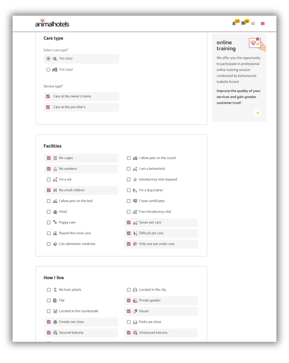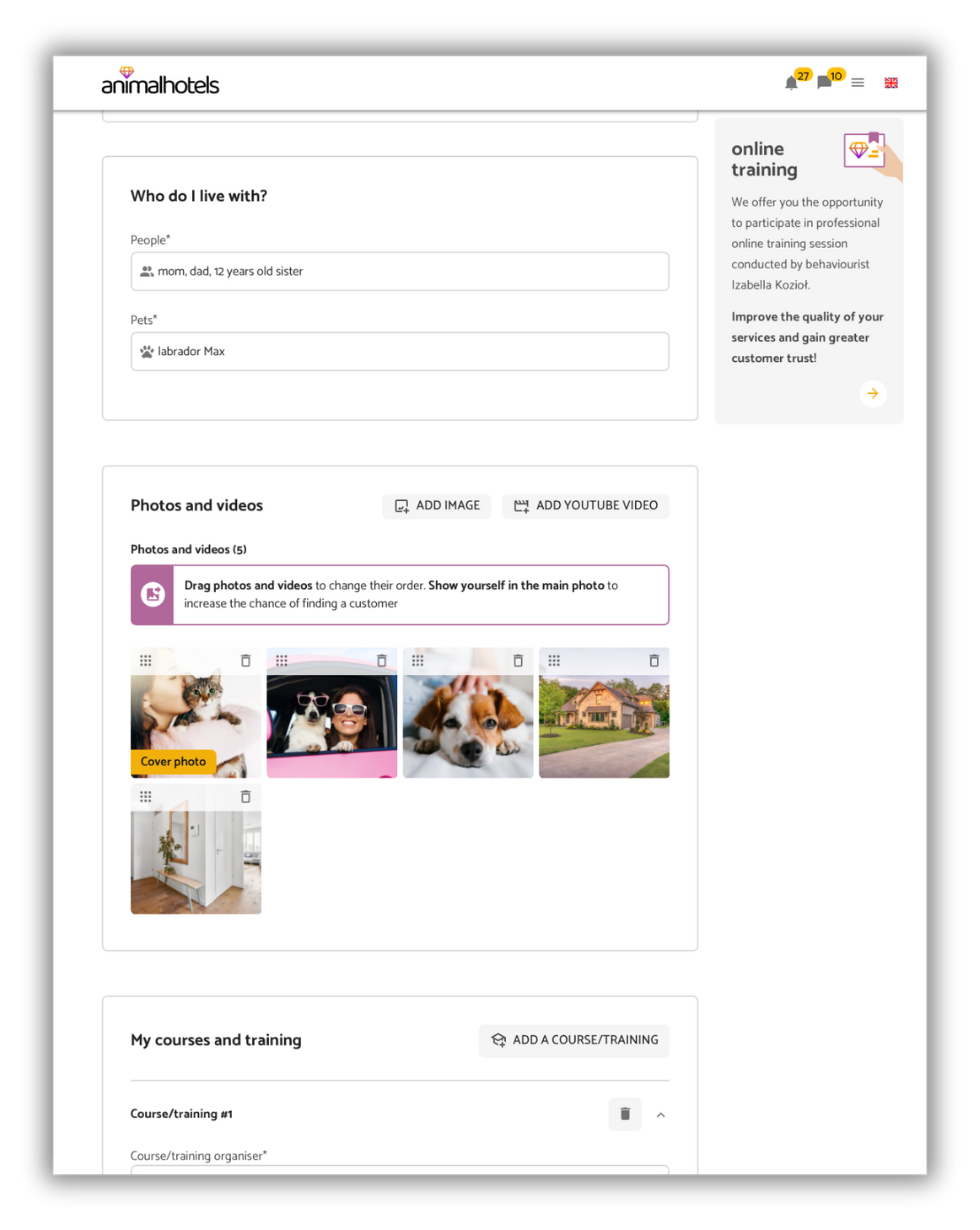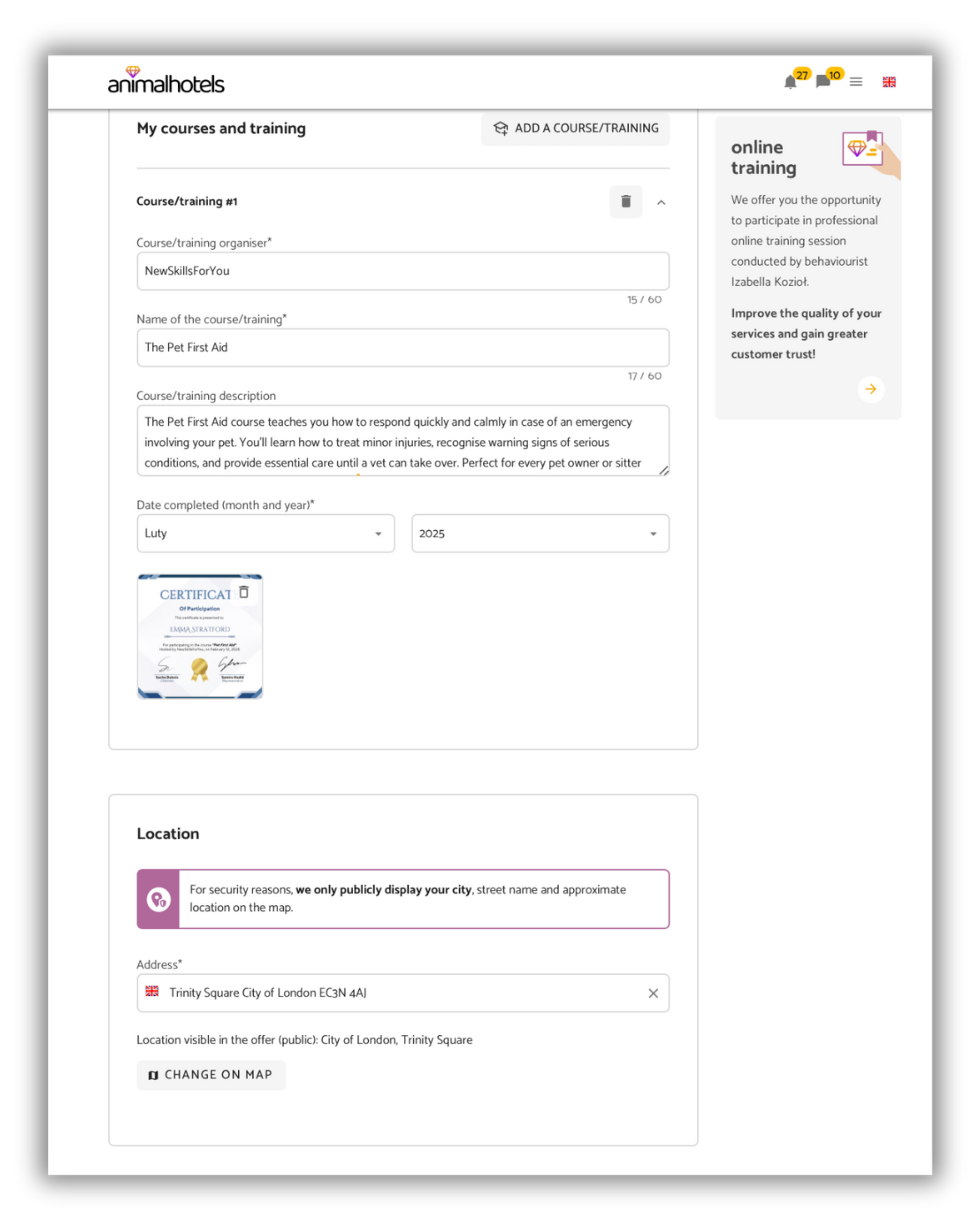 In deze sectie kan de oppasser informatie toevoegen over voltooide cursussen, trainingen en certificaten die verband houden met dierenverzorging. Dit maakt het profiel betrouwbaarder en geeft huisdiereigenaren meer vertrouwen in de vaardigheden van de oppasser.